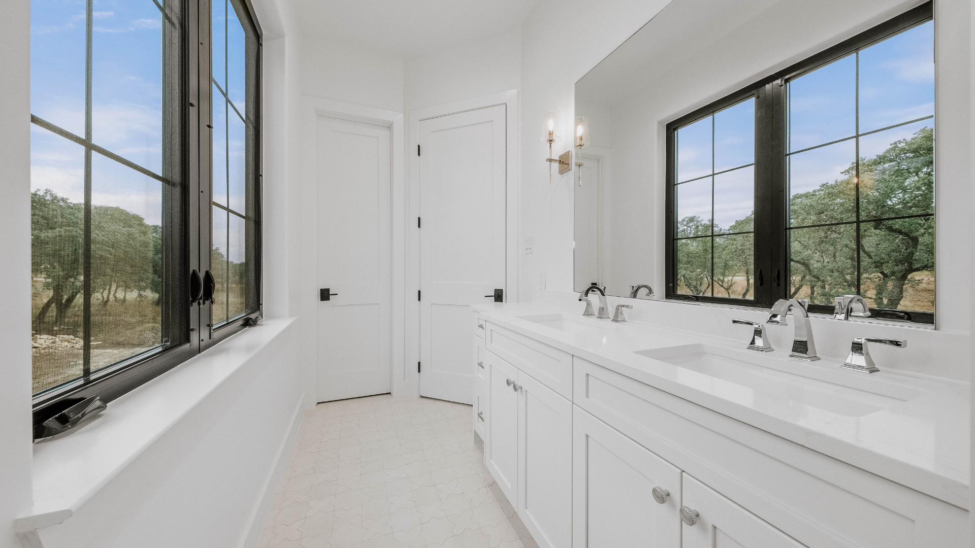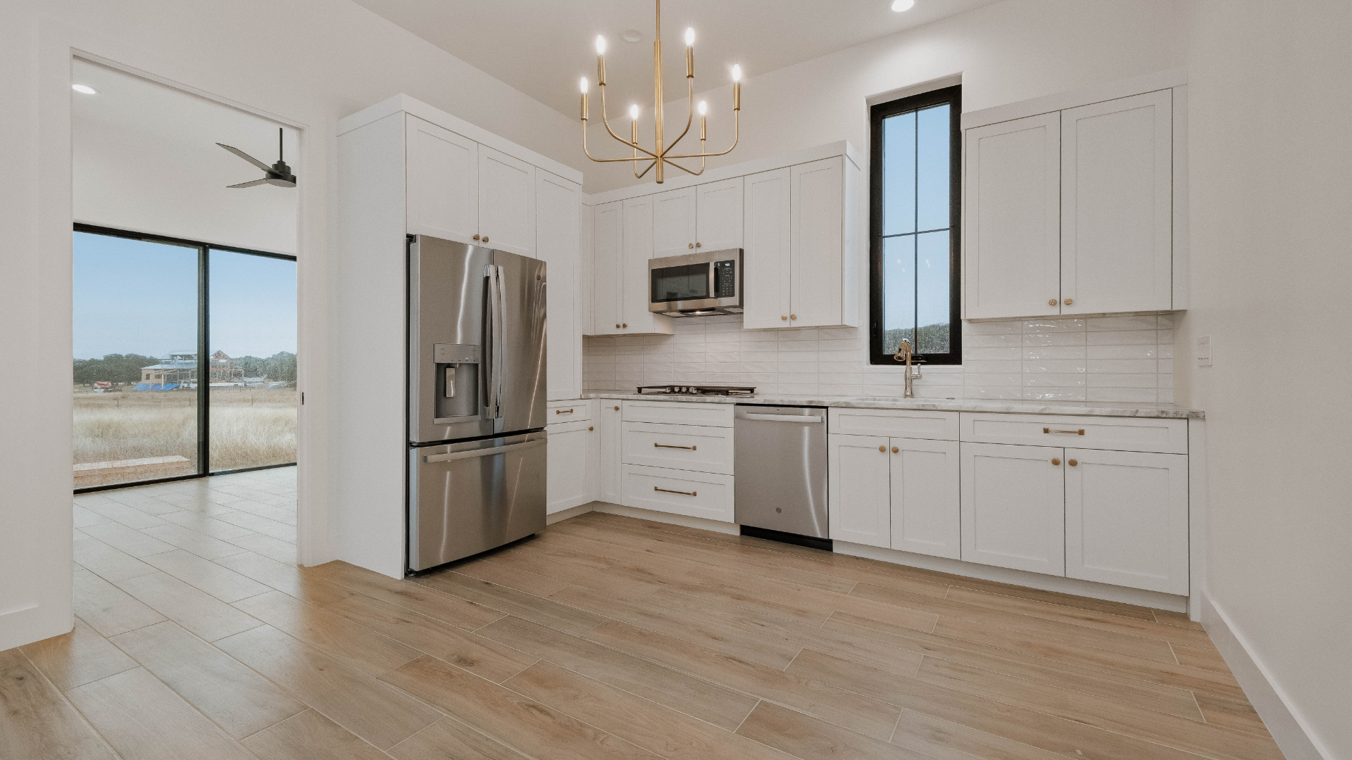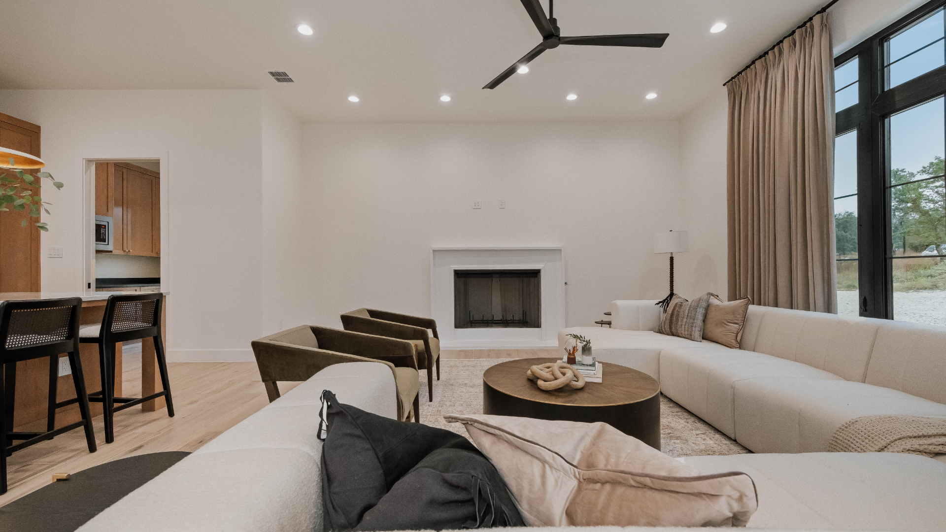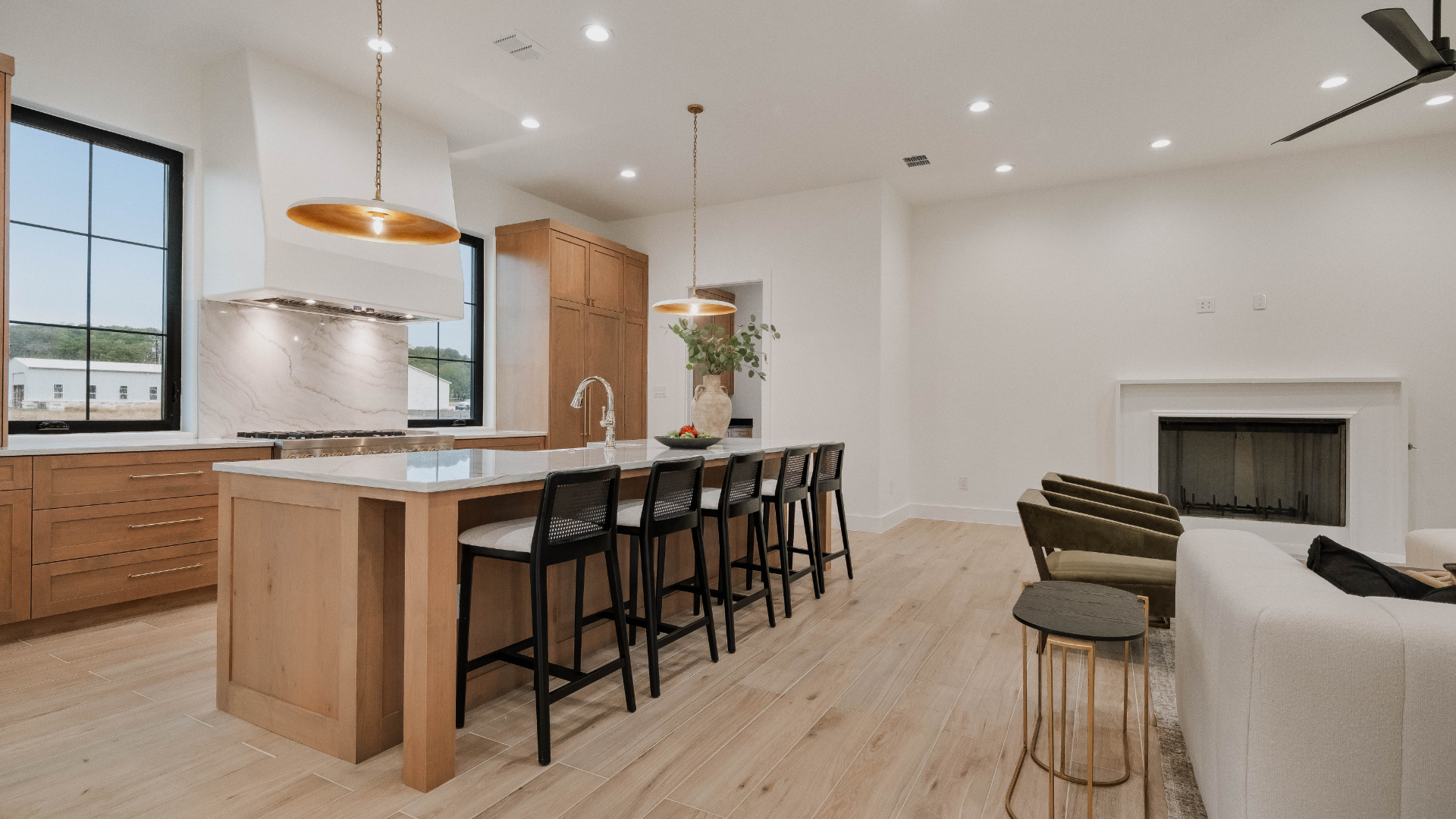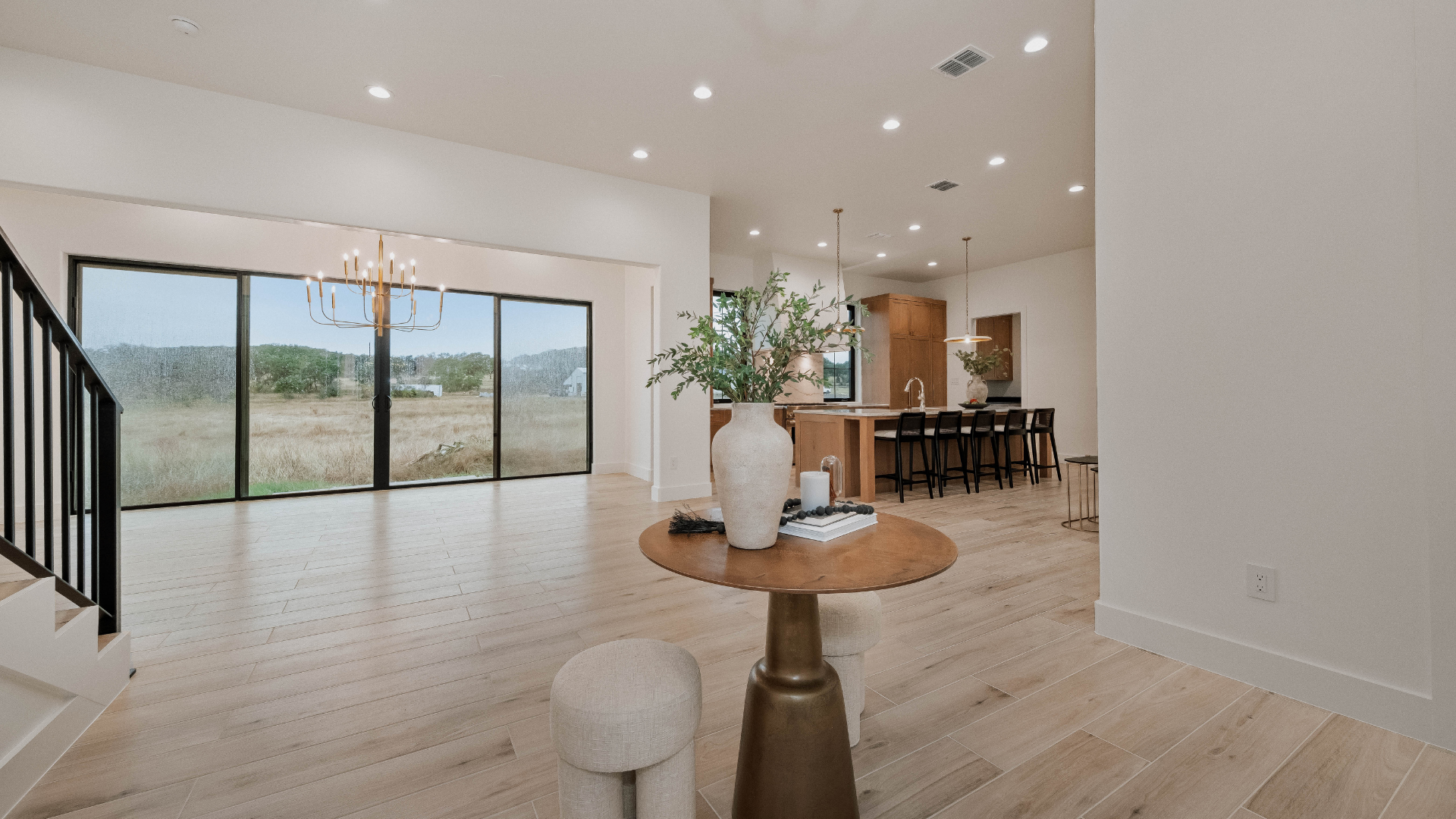 Inside, this luxury custom home showcases an open-concept floor plan designed to support modern Hill Country living. Large windows allow natural light to flow throughout the home while framing expansive outdoor views. In addition, vaulted ceilings and clean architectural lines enhance the sense of openness and comfort.